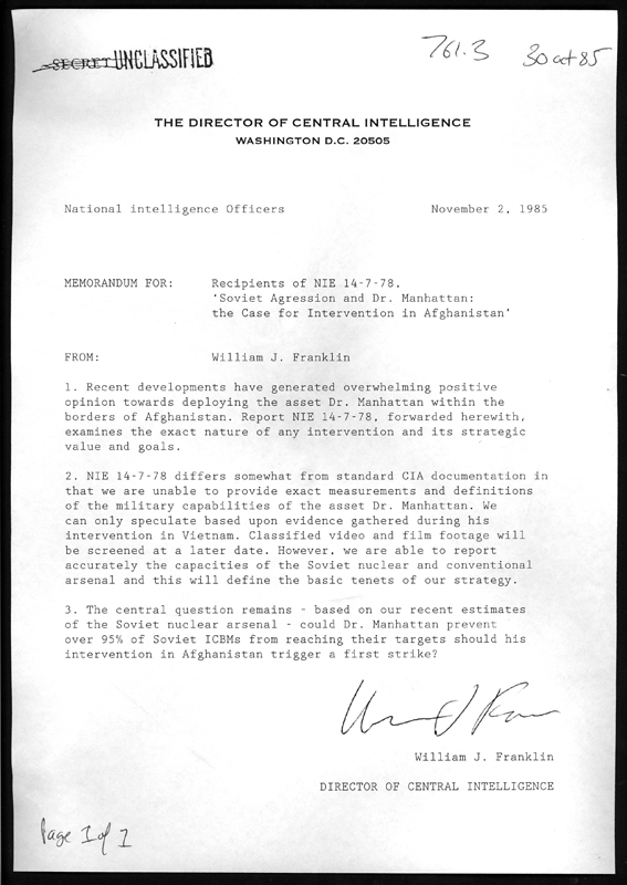 Un extrait d'un document du renseignement examinant le cas de l'intervention du Dr Manhattan en Afghanistan (non daté).