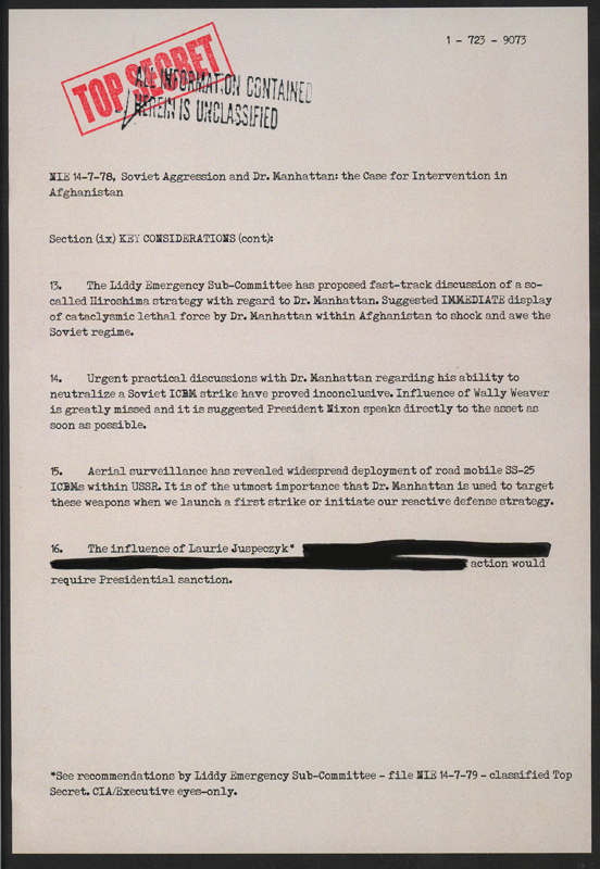 Un extrait d'un document du renseignement examinant le cas de l'intervention du Dr Manhattan en Afghanistan (non daté).