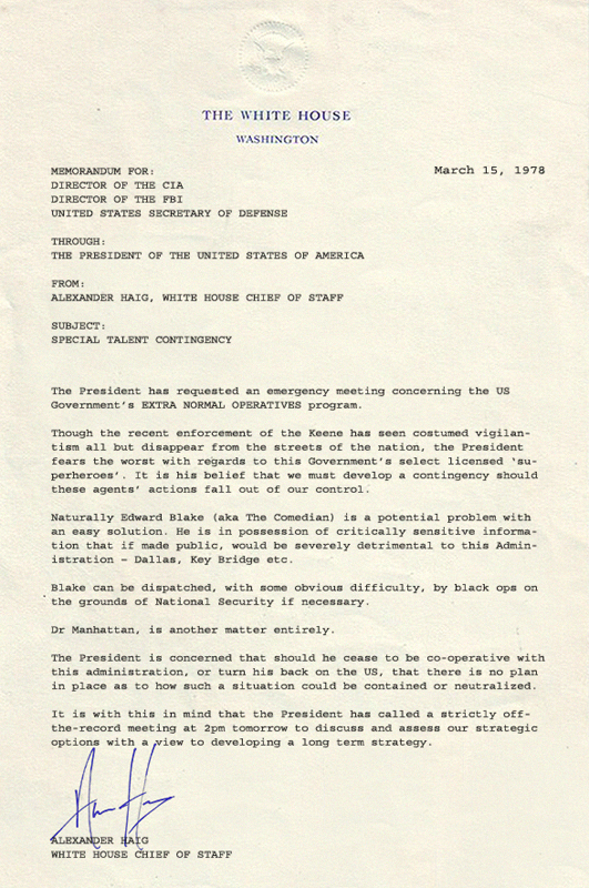 Mémorandum du chef de cabinet de la Maison Blanche identifiant la nécessité d'un plan d'urgence en relation avec les agents gouvernementaux extra-normaux Dr Manhattan et The Comedian. (15 mars 1978)